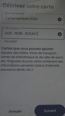 8 - La carte est enregistrée et à l'ouverture de Wallet, on voit son nom, sa description, un QR Code et une miniature à cliquer pour afficher la carte.